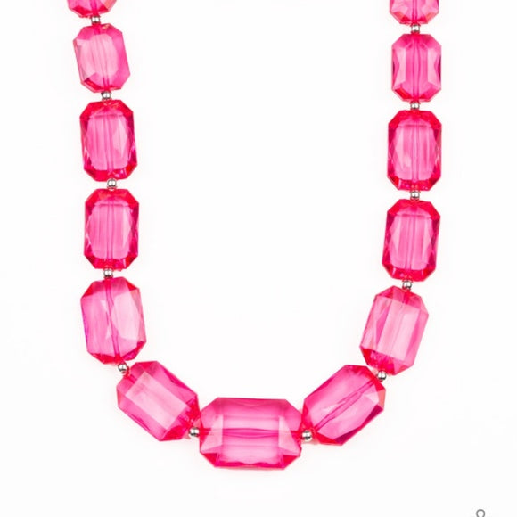 Infused with dainty silver beads, glassy pink emerald-cut beads gradually increase in size as they drape below the collar. Features an adjustable clasp closure.