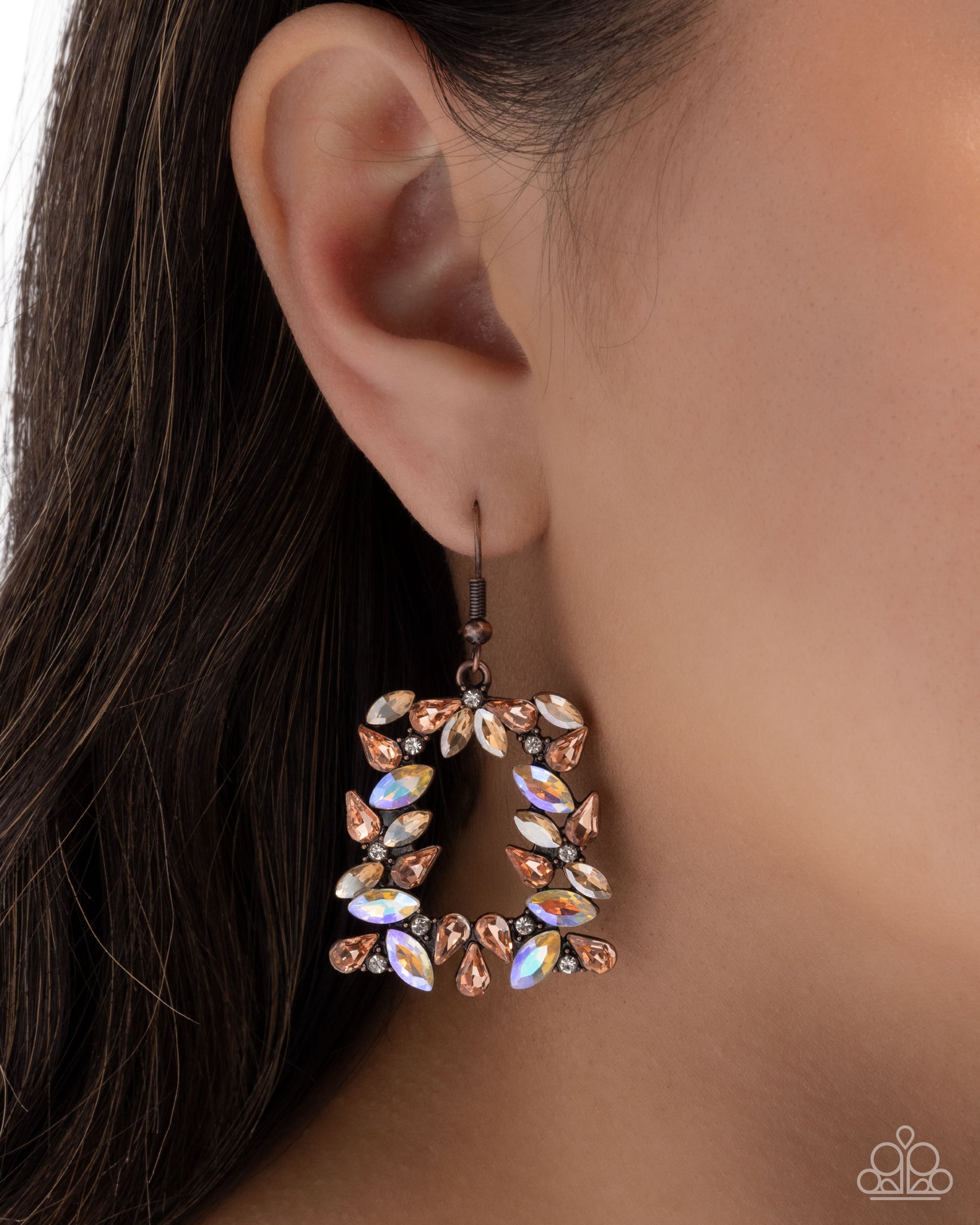 Embellished atop a copper rectangular frame, a collection of round white rhinestones, peach marquise-cut gems, champagne teardrop gems, and UV shimmery marquise-cut gems pattern and shimmer for a faceted fierce display. Earring attaches to a standard fishhook fitting.