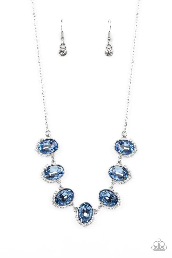 Dainty rows of glittery white rhinestones gently curve around the bottoms of oversized Glacier Lake oval gems. The sparkly frames delicately connect below the collar, creating a colorful centerpiece. Features an adjustable clasp closure.
