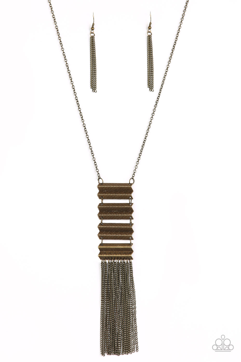 Etched in linear and edgy geometric patterns, crimped brass frames climb the torso, linking into a tribal inspired pendant. Swinging from the bottom of a lengthened brass chain, the stacked pendant gives way to a shimmery brass fringe for a seasonal finish. Features an adjustable clasp closure.