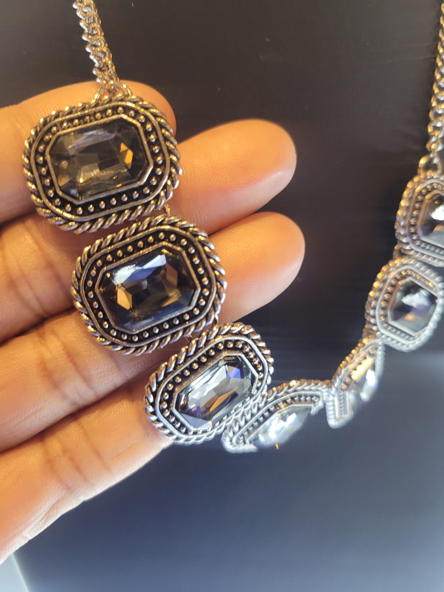Pressed into silver, chain-like frames, radiant-cut hematite rhinestones smolder below the collar in a jaw-dropping finish. Features an adjustable clasp closure.