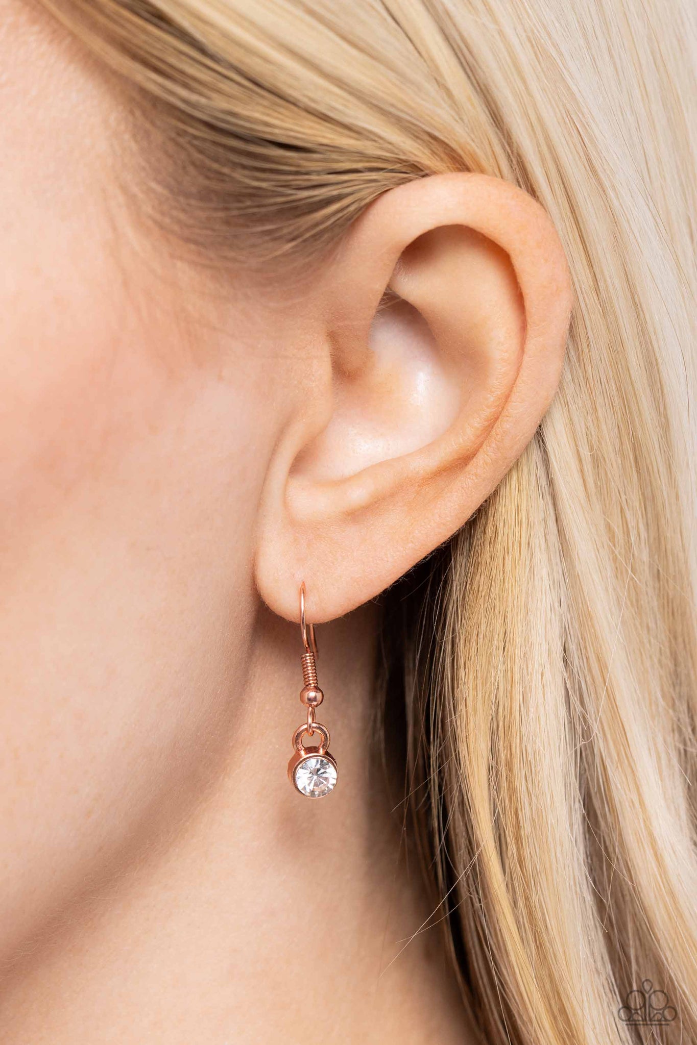 An asymmetrical coppery gem is pressed into a shiny copper frame dusted in glassy white rhinestones, resulting in a refined pendant at the bottom of a dainty shiny copper chain. Features an adjustable clasp closure.