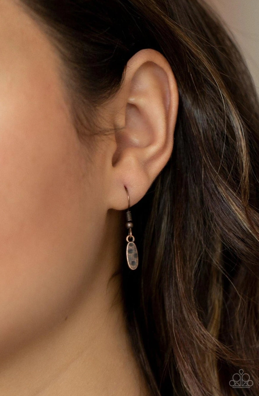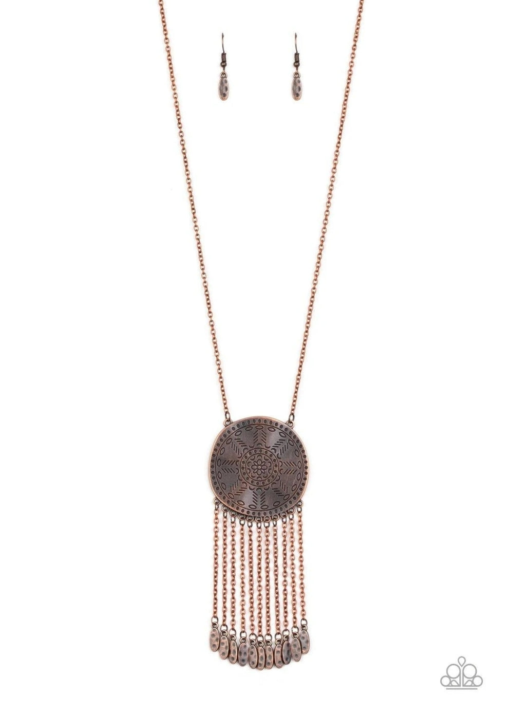 Featuring a stamped floral design, a copper disc swings from the bottom of a lengthened copper chain. Shimmery copper chains with oval hammered pendants stream from the bottom of the tribal inspired pendant, creating a whimsical fringe. Feature an adjustable clasp closure.