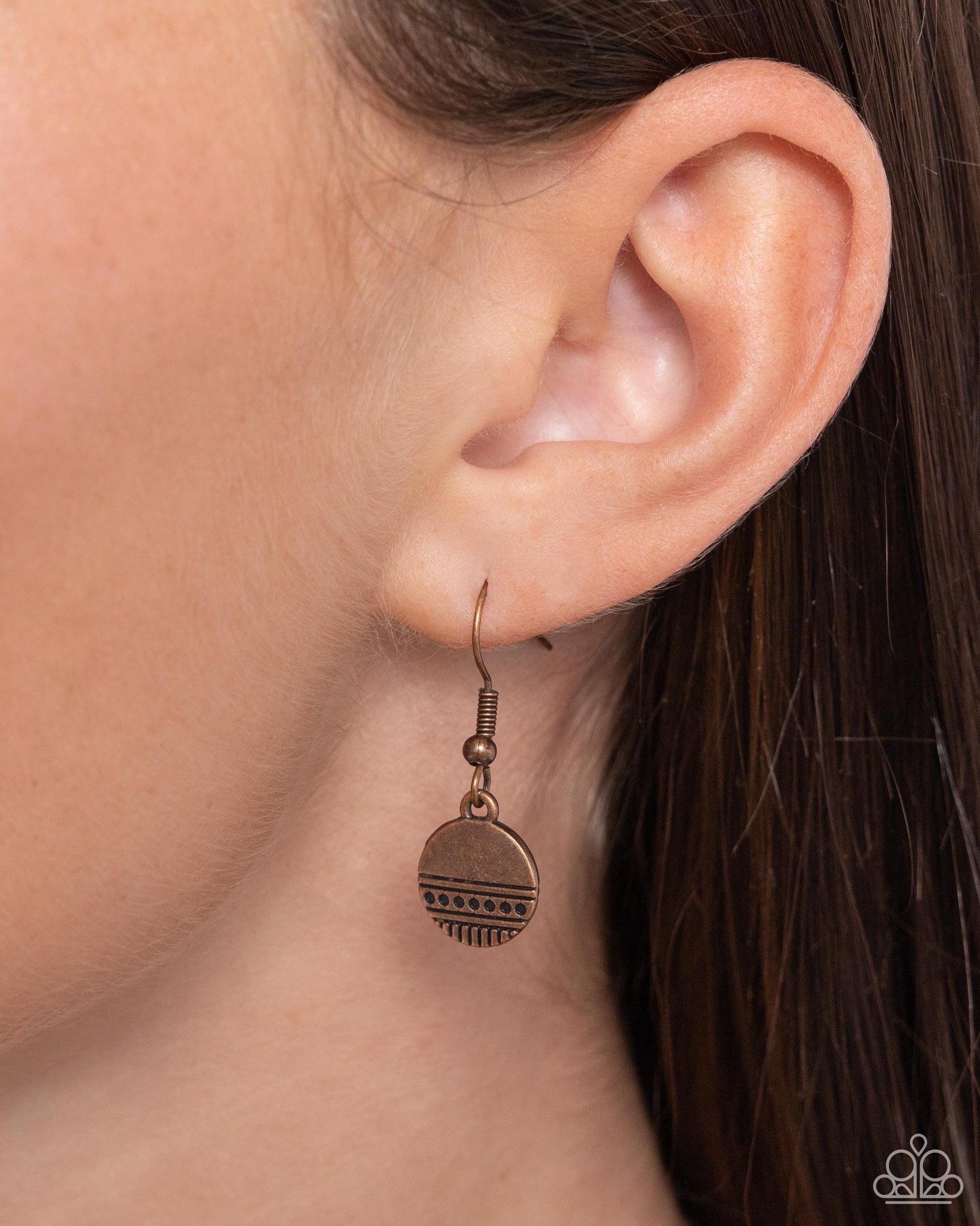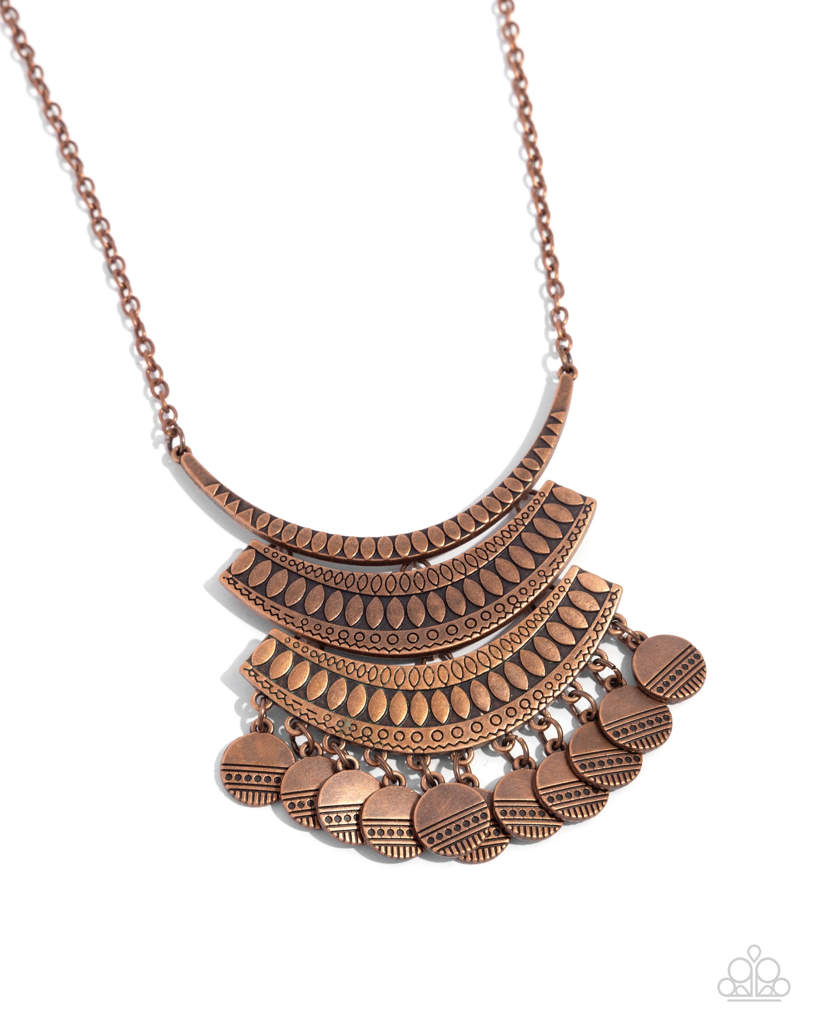 Embossed and stamped with rustic geometric patterns, a single bowing copper bar links with a stack of decorative copper half moon frames at the bottom of an extended copper chain. Stamped with matching texture, antiqued copper discs dance from the bottom of the display for an EMPRESS-ive finish. Features an adjustable clasp closure.
