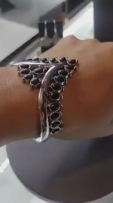 Black oval stones, encased in studded silver frames, line the edge of a daring V-shaped silver cuff. A gathering of black stones adorns the center of the bracelet, adding a finishing touch to the rustically regal cuff.