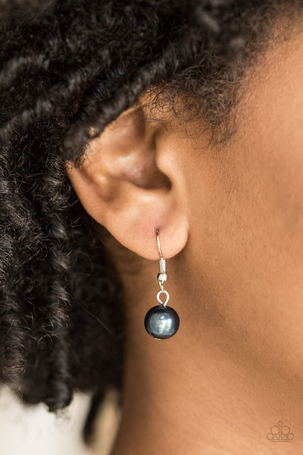 Pearly blue beads and shimmery silver hoops trickle along glistening silver chains, creating mismatched layers down the chest. Features an adjustable clasp closure.