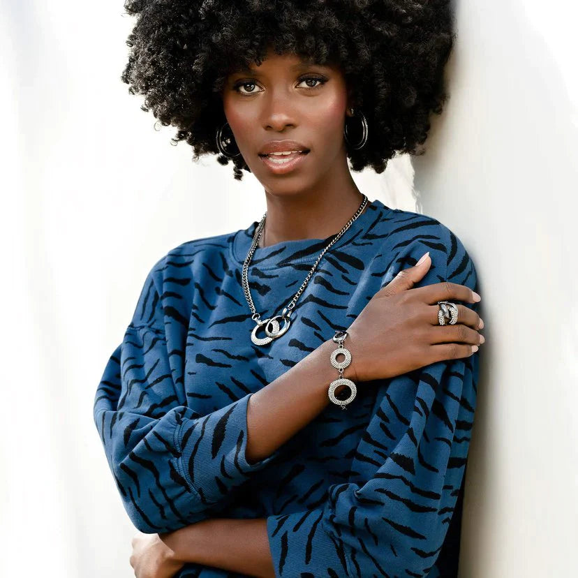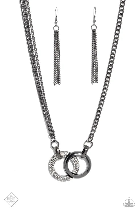 A pair of beveled gunmetal hoops interlock at the center of the collarbone, creating an eye-catching pendant. One hoop is coated in white rhinestones, while the other showcases a high-sheen finish, providing an intriguing collision of texture. The interlocking pendant is attached to a thick gunmetal chain, with a pair of daintier gunmetal chains added along one side for an asymmetrical finish. Features an adjustable clasp closure.