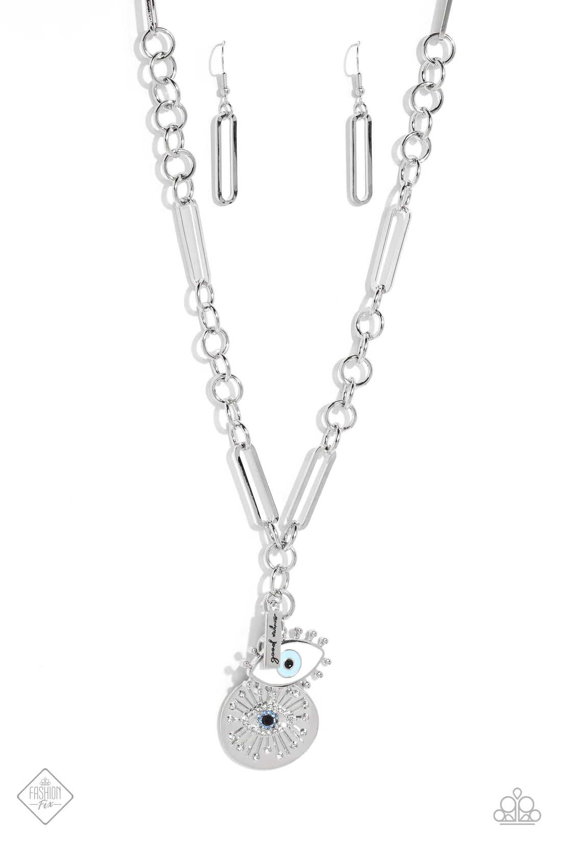 A harmonious compilation of charms, featuring tranquil shades of blue and accents of black, gather at the bottom of a handcrafted chain. Elongated paperclip links and oversized jump rings interlock as they fall down the neckline, leading to the boisterous collection of charms, which include a rectangular silver plate stamped with the phrase, "good vibes," a warped silver disc embossed in a sunburst pattern, and an eye with exaggerated eyelashes. Features an adjustable clasp closure.