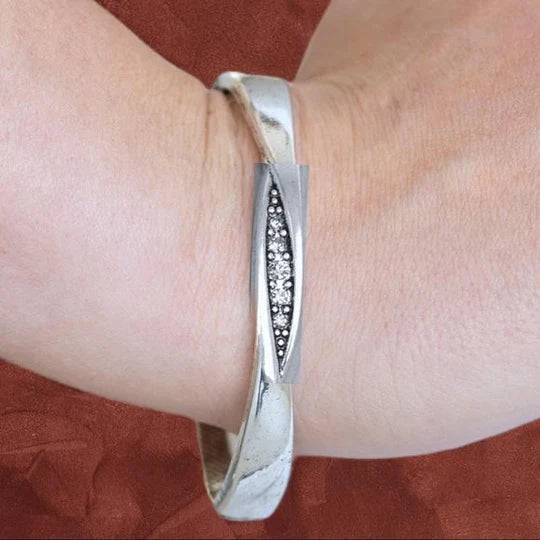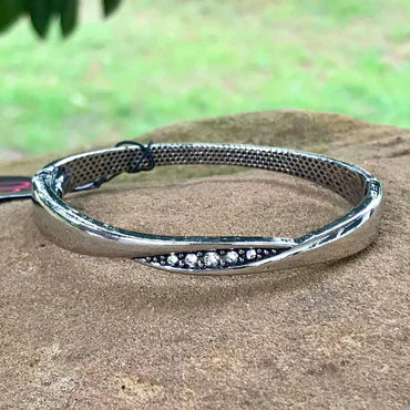 The studded center of a dainty silver bangle-like bracelet is encrusted in a single row of white rhinestones for a refined finish. Features a hinged closure.