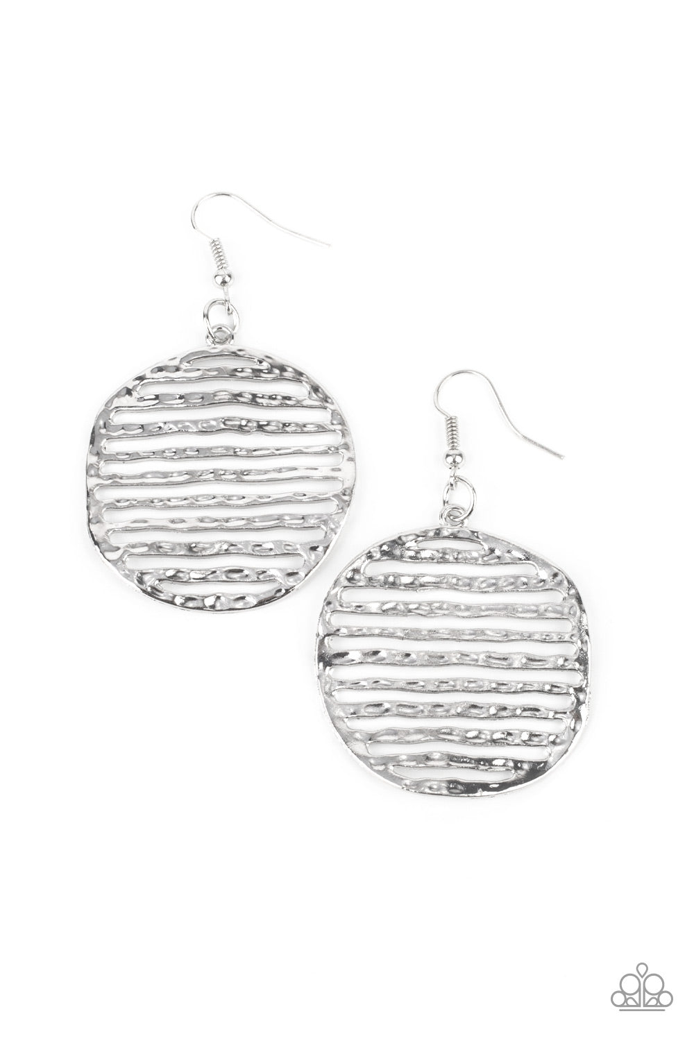 Lightly hammered shiny silver bars stack inside an airy circular frame, creating a wavy glimmering lure. Earring attaches to a standard fishhook fitting.