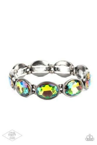 Bracelet: Glassy OIL SPILL gems are pressed into sleek silver frames. Infused with dainty silver beads, the glittery frames are threaded along stretchy elastic bands for a glamorous look around the wrist.