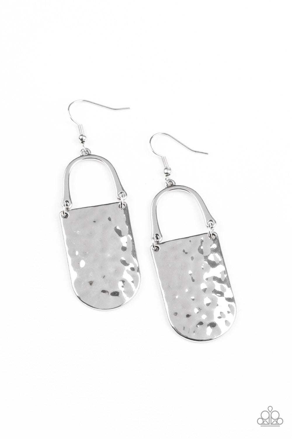 A hammered silver piece links to the bottom of a bowing silver bar, creating an abstract lure. Earring attaches to a standard fishhook fitting.