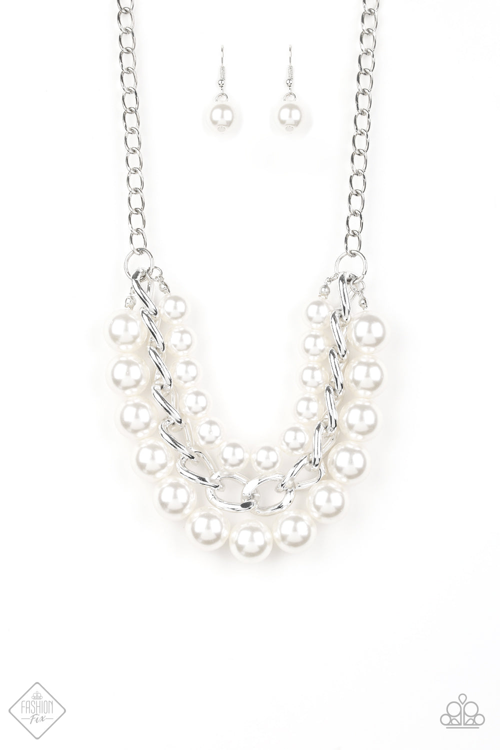 Two strands of dramatic white pearls collide with a strand of oversized silver chain. The layers fall along the collar to create a unique statement piece that boasts a mix of industrial grit and timeless refinement. Features an adjustable clasp closure.