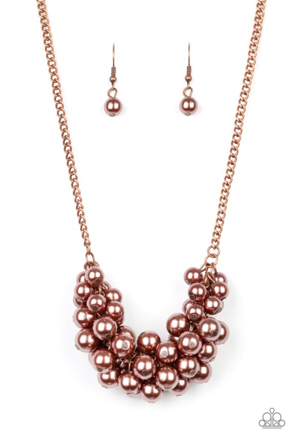 A collection of coppery pearls dangle from the bottom of a glistening copper chain, creating a glamorously clustered display below the collar. Features an adjustable clasp closure.