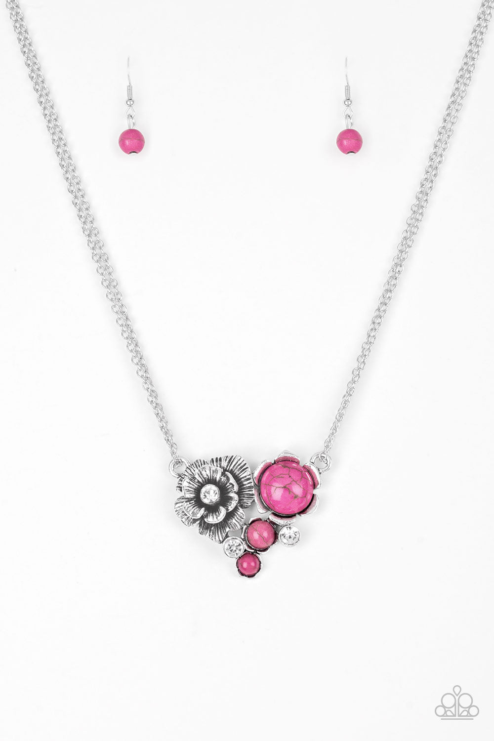 Featuring dazzling white rhinestones and vivacious pink stone centers, a collection of shimmery silver floral frames join below the collar for a seasonal look. Features an adjustable clasp closure.