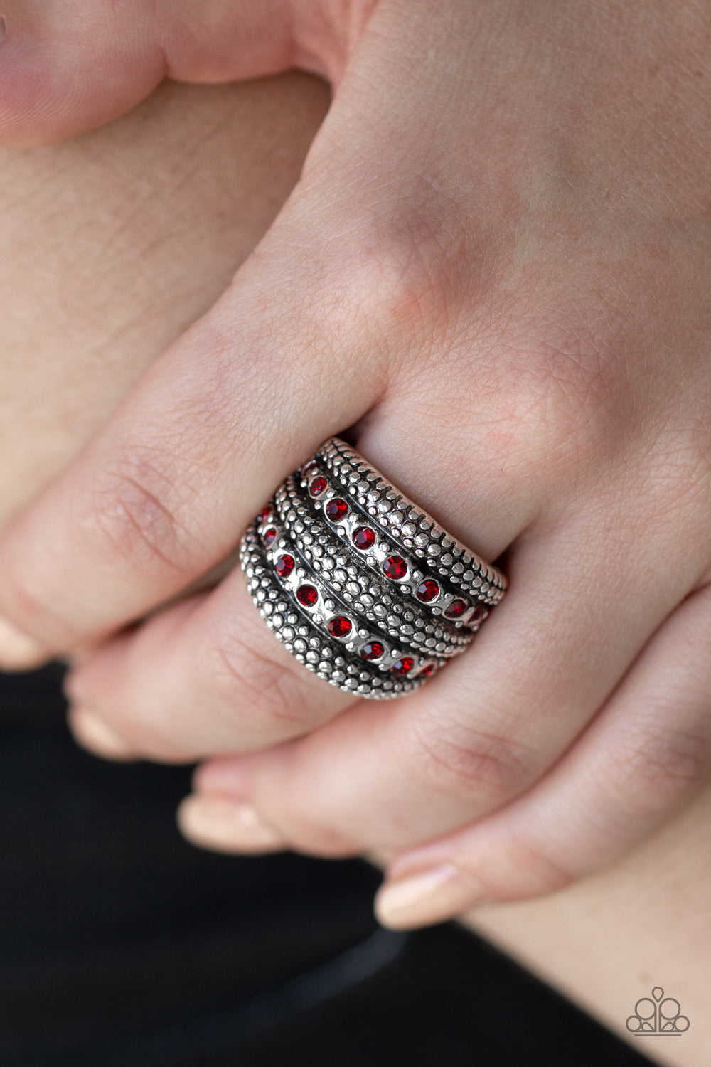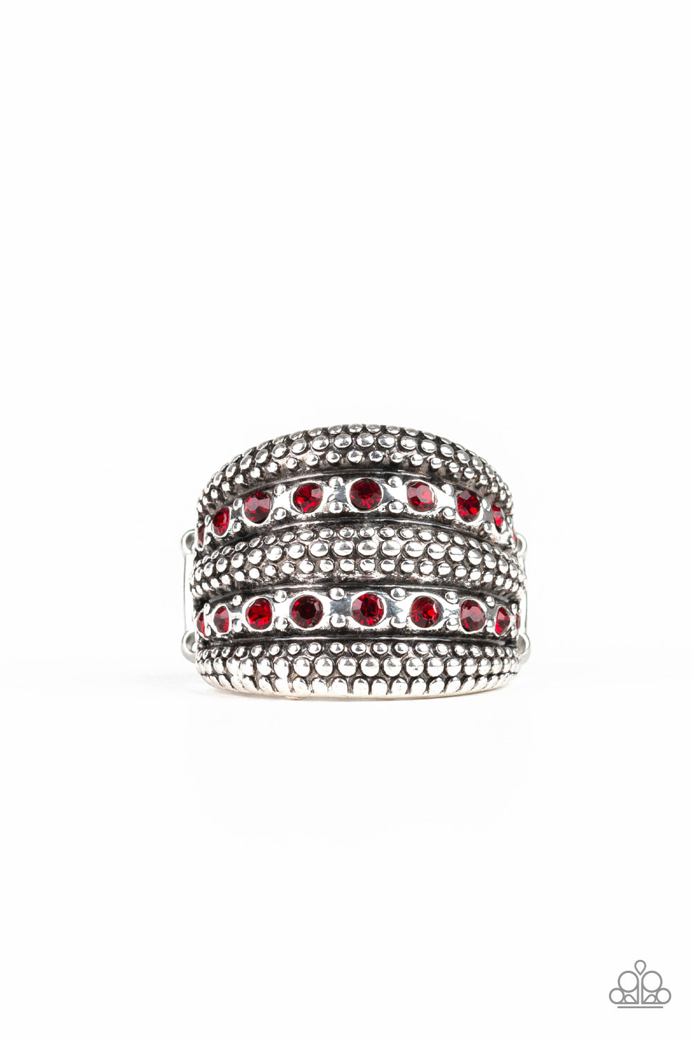 Two rows of fiery red rhinestones are encrusted along a thick silver band radiating in sections of shimmery studs for a sassy look. Features a stretchy band for a flexible fit.