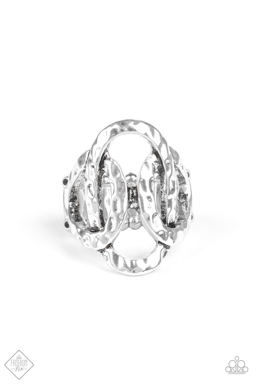 Hammered in rugged textures, three antiqued silver frames interlock across the finger for an edgy look. Features a stretchy band for a flexible fit.