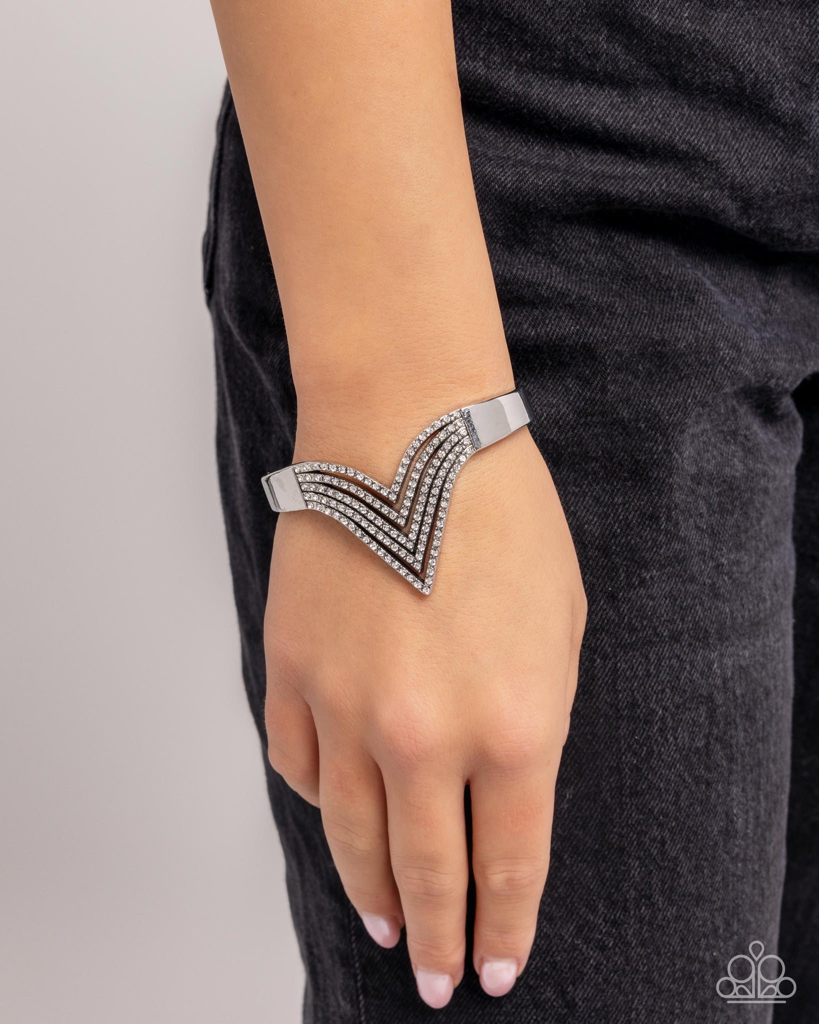 Rows of dainty white rhinestones and silver studs line the edges of a layered, daring V-shaped silver cuff for a rustically regal look.