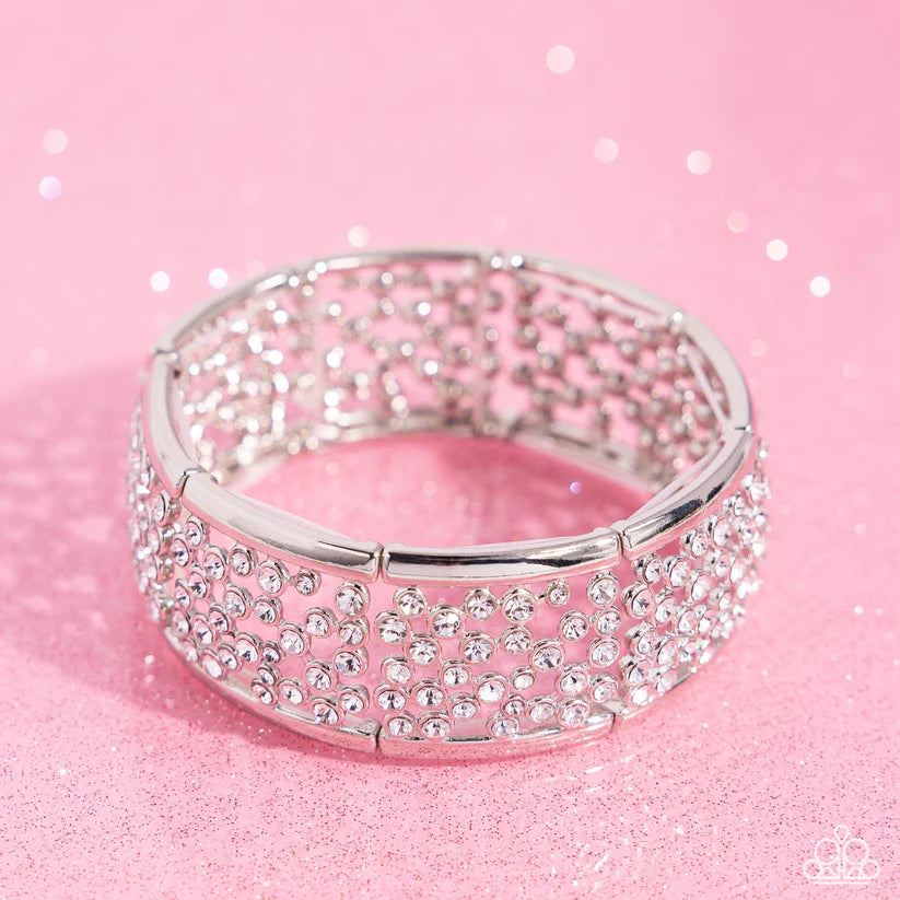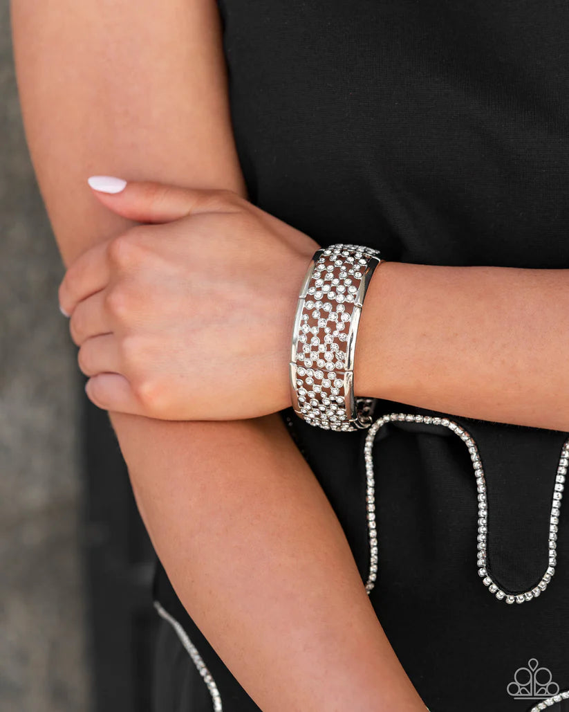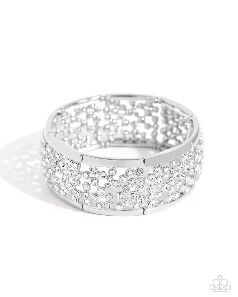 Scattered between two curved silver bars, a collection of white rhinestones in circular fittings curve up the wrist along elastic stretchy bands for a framed, shimmery showcase.