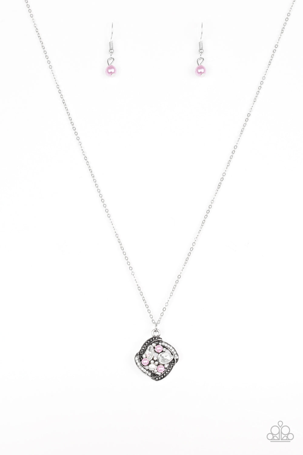 Alternating in silver studs and glassy white rhinestones, dainty silver bars fold around a sparkling mishmash of glassy white rhinestones and dainty purple pearls. The sparkling pendant swings below the collar for a timeless look. Features an adjustable clasp closure.