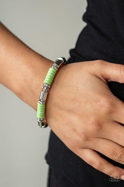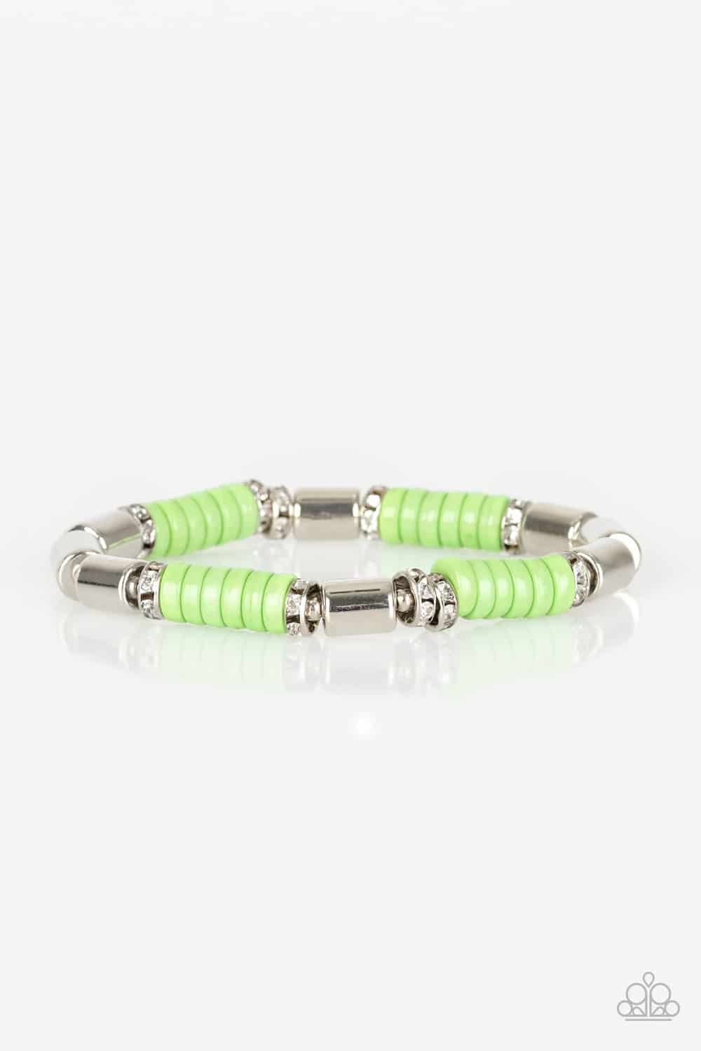 A collection of white rhinestone encrusted rings, silver accents, and shiny green beads are threaded along a stretchy band around the wrist for a whimsical flair.