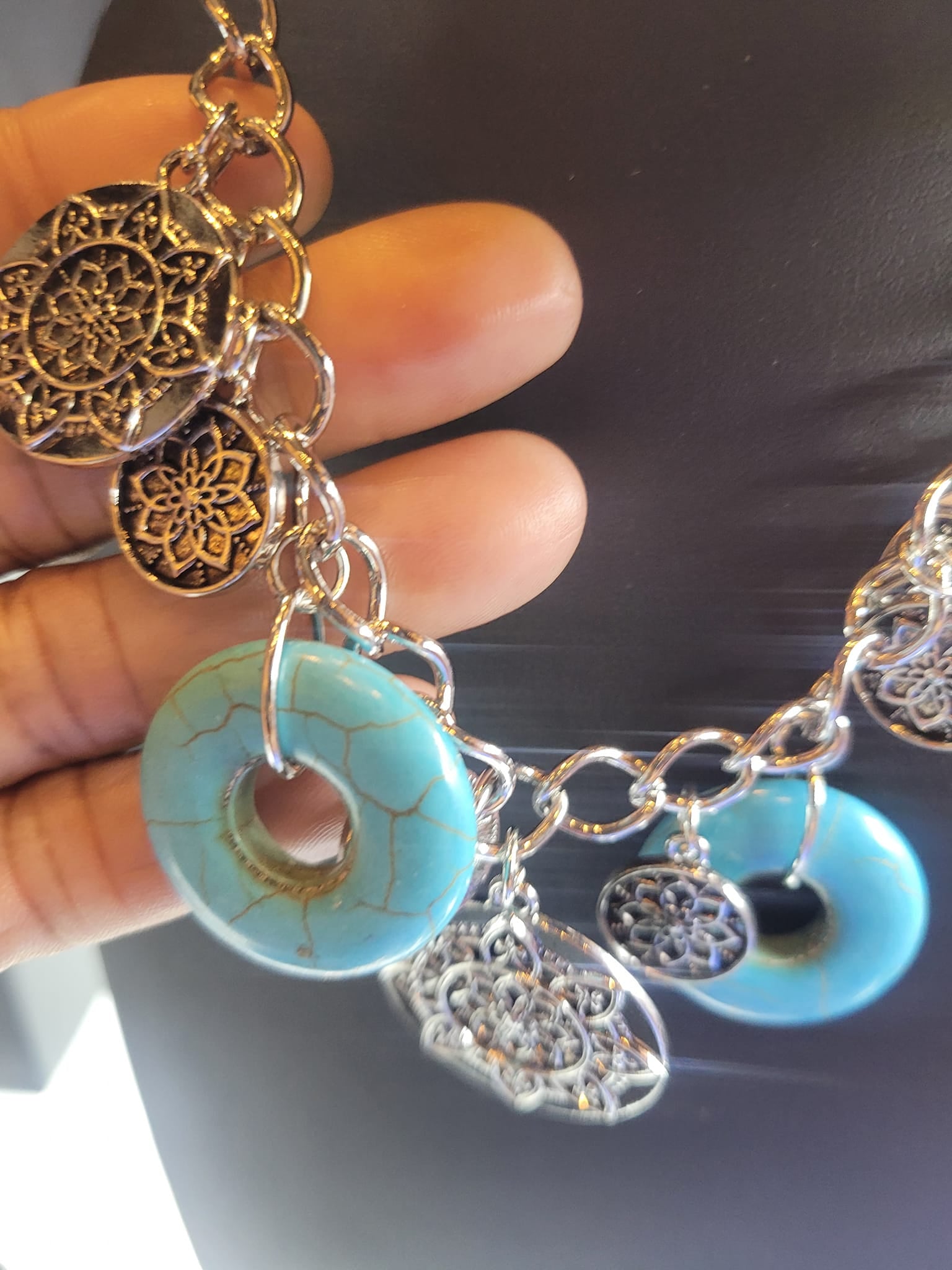 A collection of silver discs, embellished with intricate mandala-like designs, dances along a thick silver chain, with a pair of polished turquoise stone rings adding a pop of color to the rustic design. Features an adjustable clasp closure.