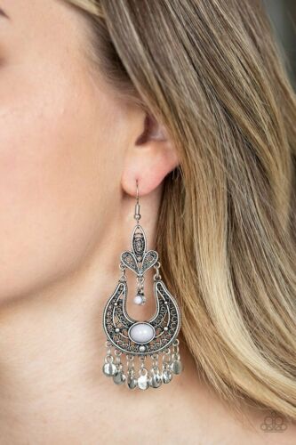 Swirling with vine-like filigree, ornate silver frames delicately link into a stacked frame. Infused with vivacious purple beads, the whimsical frame gives way to a fringe of glistening silver discs for a playful flair. Earring attaches to a standard fishhook fitting.